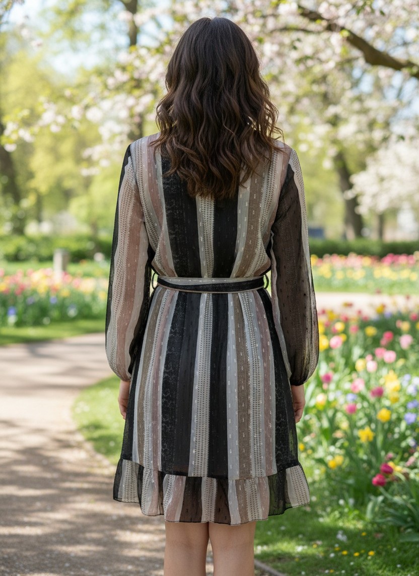 Il modello presenta una linea morbida con scollo valorizzante e una cintura in vita che permette di definire la silhouette in modo armonioso. Le maniche lunghe leggere e la gonna con movimento donano un tocco romantico e raffinato, ideale sia per il giorno che per la sera.