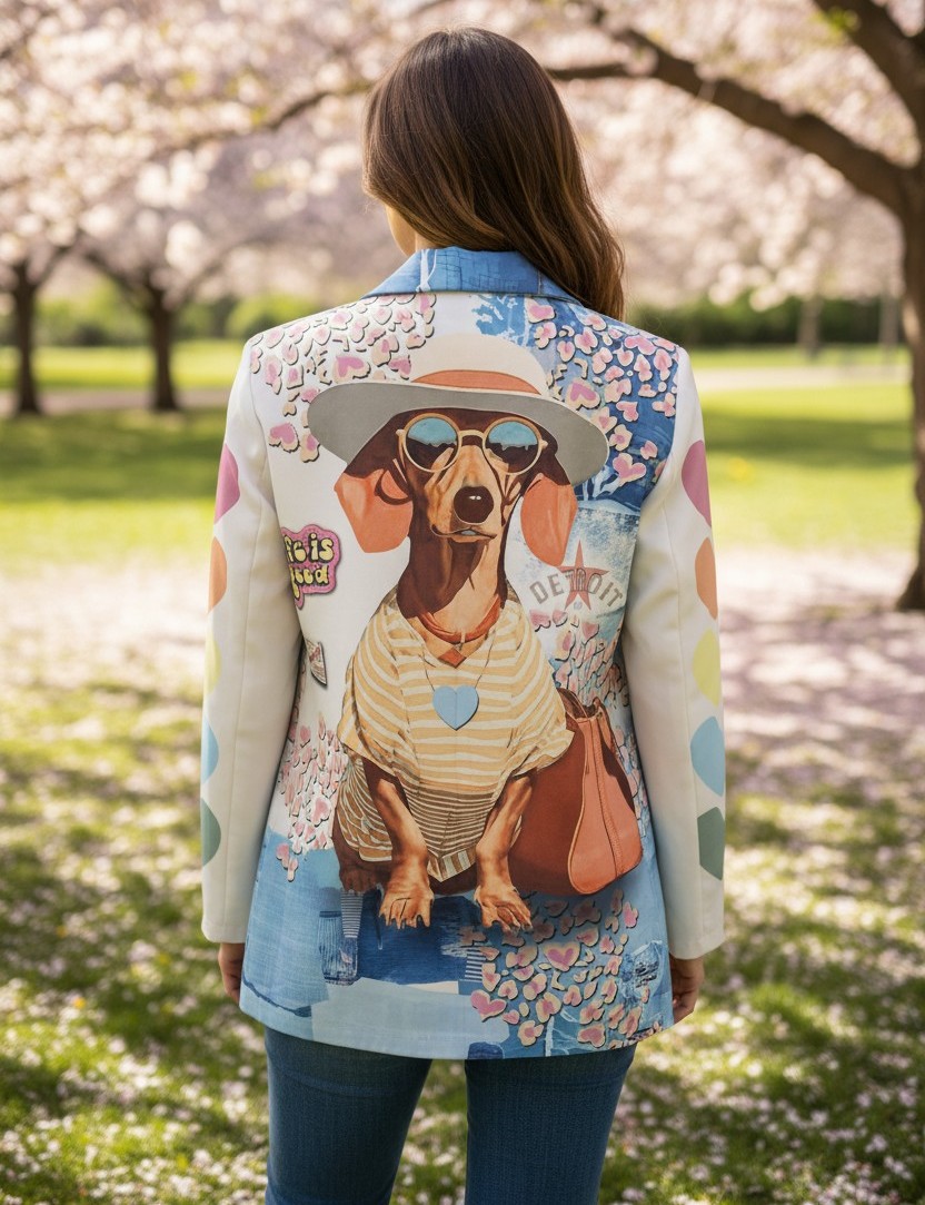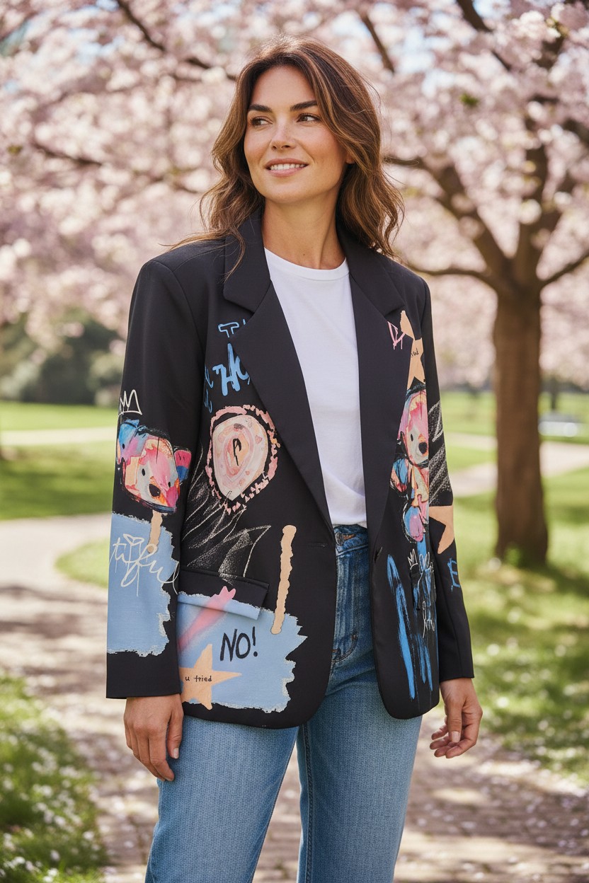 Questo blazer fantasia è il capo ideale per chi ama distinguersi con uno stile originale e contemporaneo. Il taglio classico con rever elegante incontra un design creativo, rendendolo perfetto per outfit dinamici e di forte impatto.
