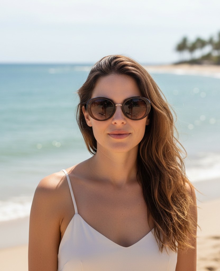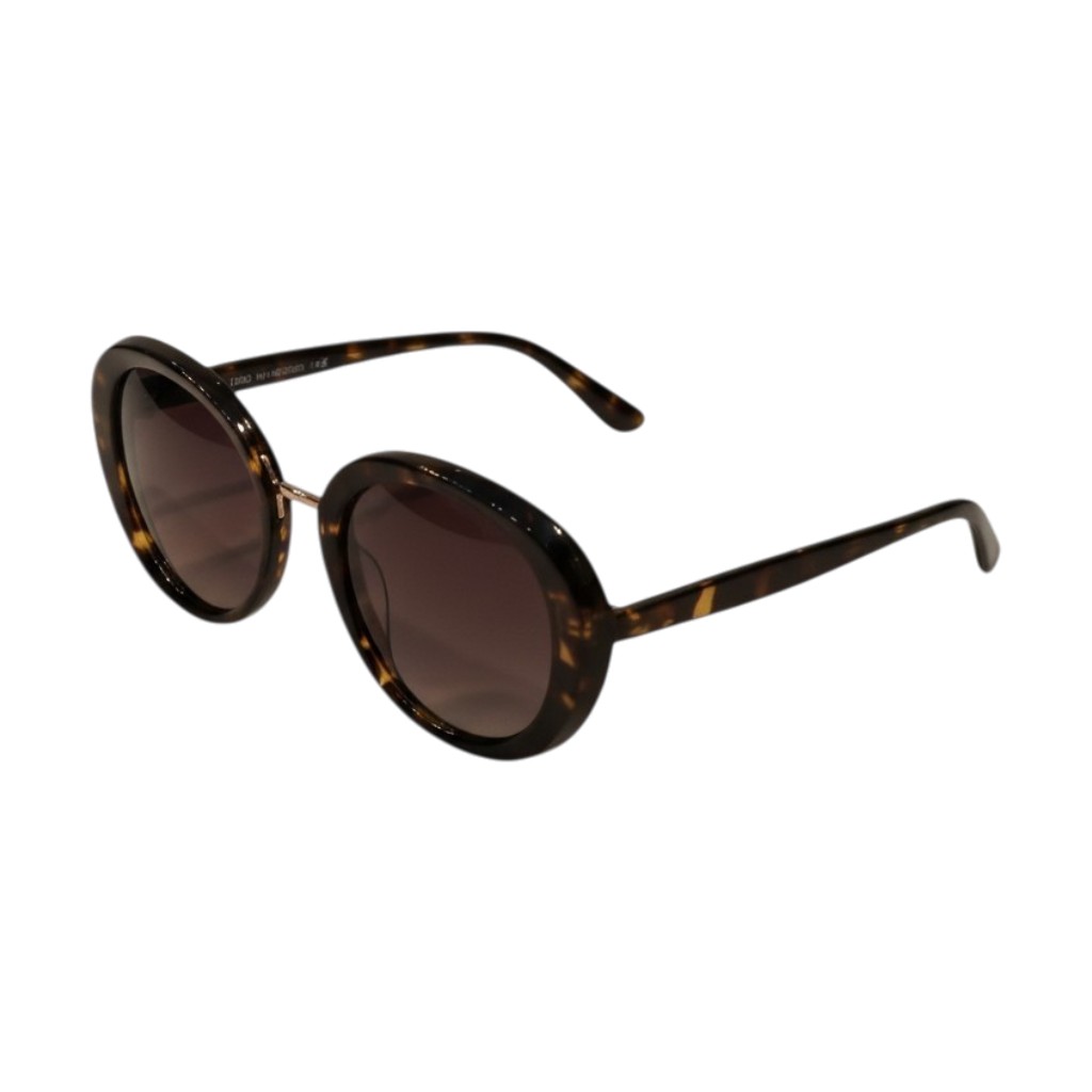 La forma rotonda oversize valorizza il viso donando armonia e carattere, mentre la texture tartarugata aggiunge profondità e raffinatezza al design. Le lenti sfumate garantiscono comfort visivo e protezione, ideali per le giornate di sole al mare o in città.