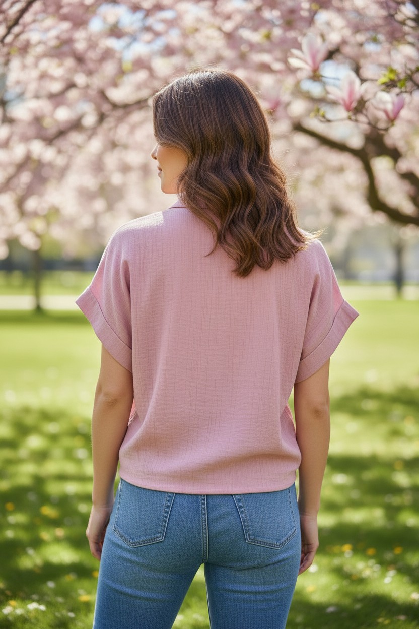 Le maniche corte con risvolto e il colletto classico rendono questa blusa elegante ma allo stesso tempo casual, perfetta per essere abbinata a jeans, pantaloni o gonne. La tasca frontale aggiunge un dettaglio pratico e stiloso.