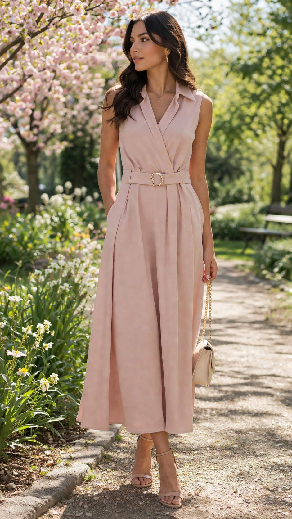 Questo abito midi da donna in elegante tonalità rosa cipria è la scelta perfetta per un look raffinato e femminile.