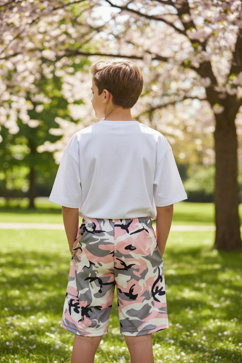 Rompere gli schemi con stile: i nostri bermuda portano il classico motivo mimetico su un livello completamente nuovo. Grazie all'audace combinazione di rosa, grigio e bianco, questi pantaloncini sono il capo statement ideale per i ragazzi che amano un look streetwear originale e pieno di personalità.