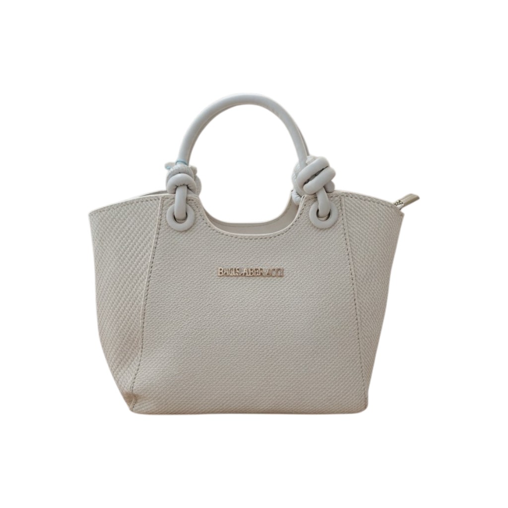 I doppi manici con lavorazione annodata donano un tocco distintivo e contemporaneo, mentre la chiusura con zip garantisce sicurezza e praticità. Lo spazio interno è perfetto per contenere gli essenziali, rendendola una scelta versatile per il giorno.