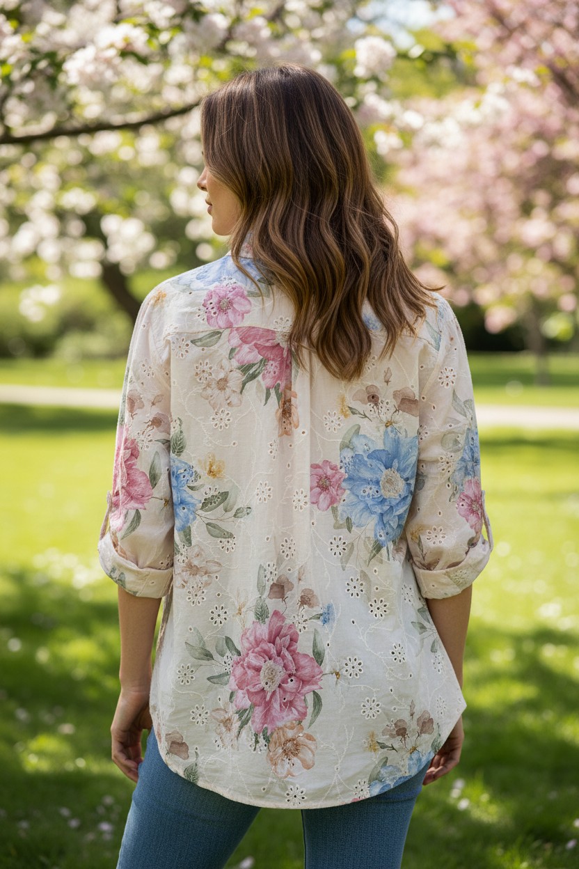 Questa camicia da donna con fantasia floreale è il capo perfetto per aggiungere un tocco romantico e fresco ai tuoi look estivi.