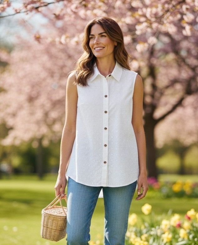 Questa camicia smanicata da donna è il capo perfetto per affrontare le giornate più calde con stile e leggerezza. Realizzata in tessuto traforato effetto sangallo, unisce eleganza e freschezza in un design semplice ma raffinato.
