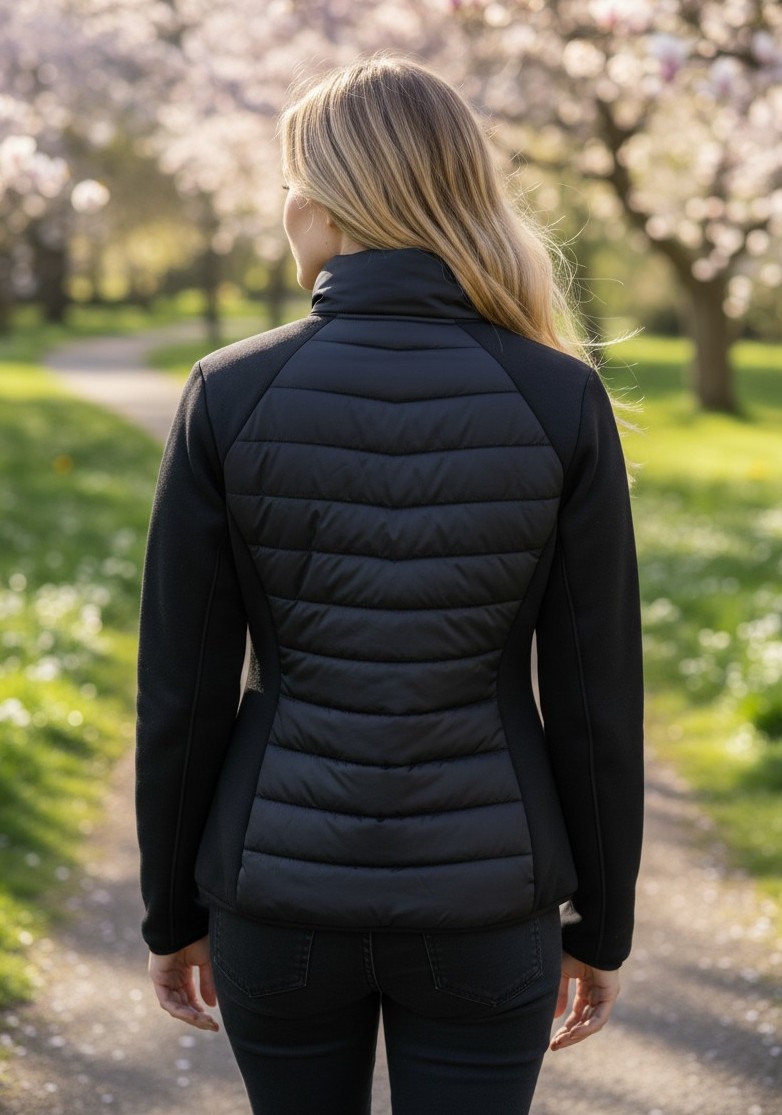 Il design combina una parte frontale trapuntata con maniche in tessuto tecnico elasticizzato, offrendo calore dove serve e massima libertà di movimento. La chiusura con zip e il taglio aderente valorizzano la silhouette, rendendola perfetta per un utilizzo quotidiano.