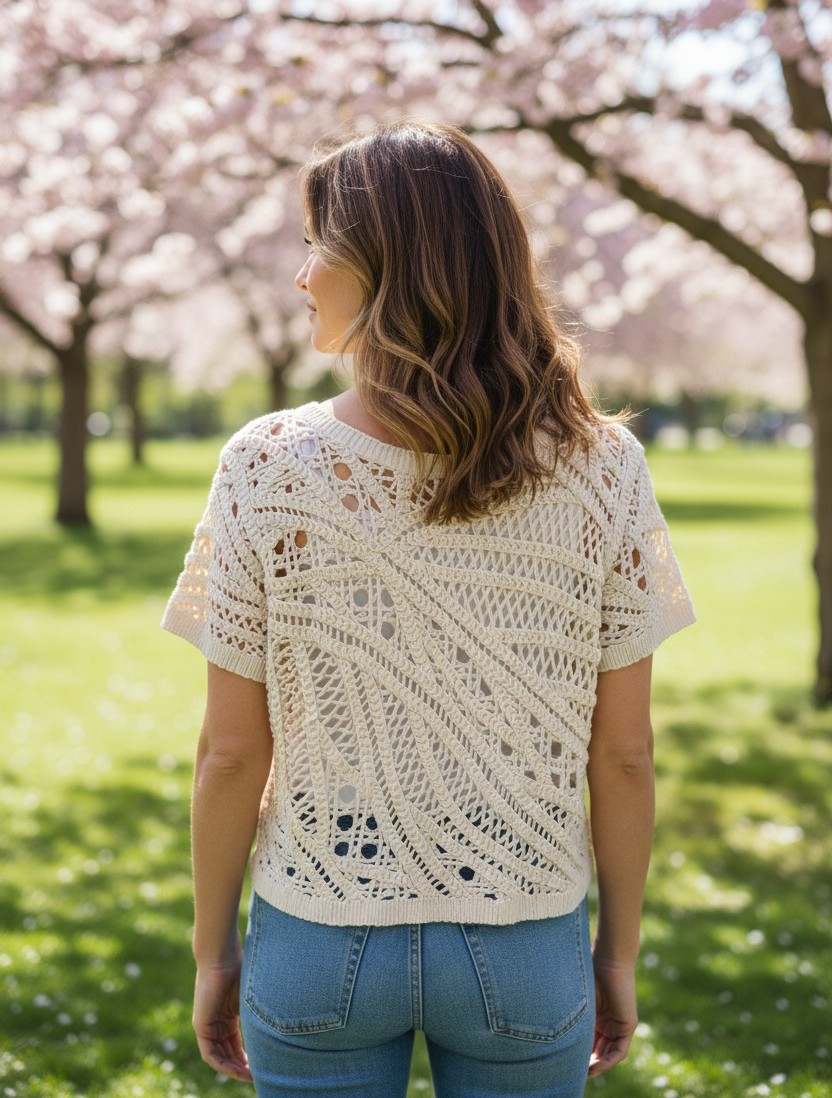 Questa maglia traforata da donna è il capo perfetto per la stagione estiva, grazie alla sua lavorazione crochet che crea un elegante effetto vedo-non-vedo.