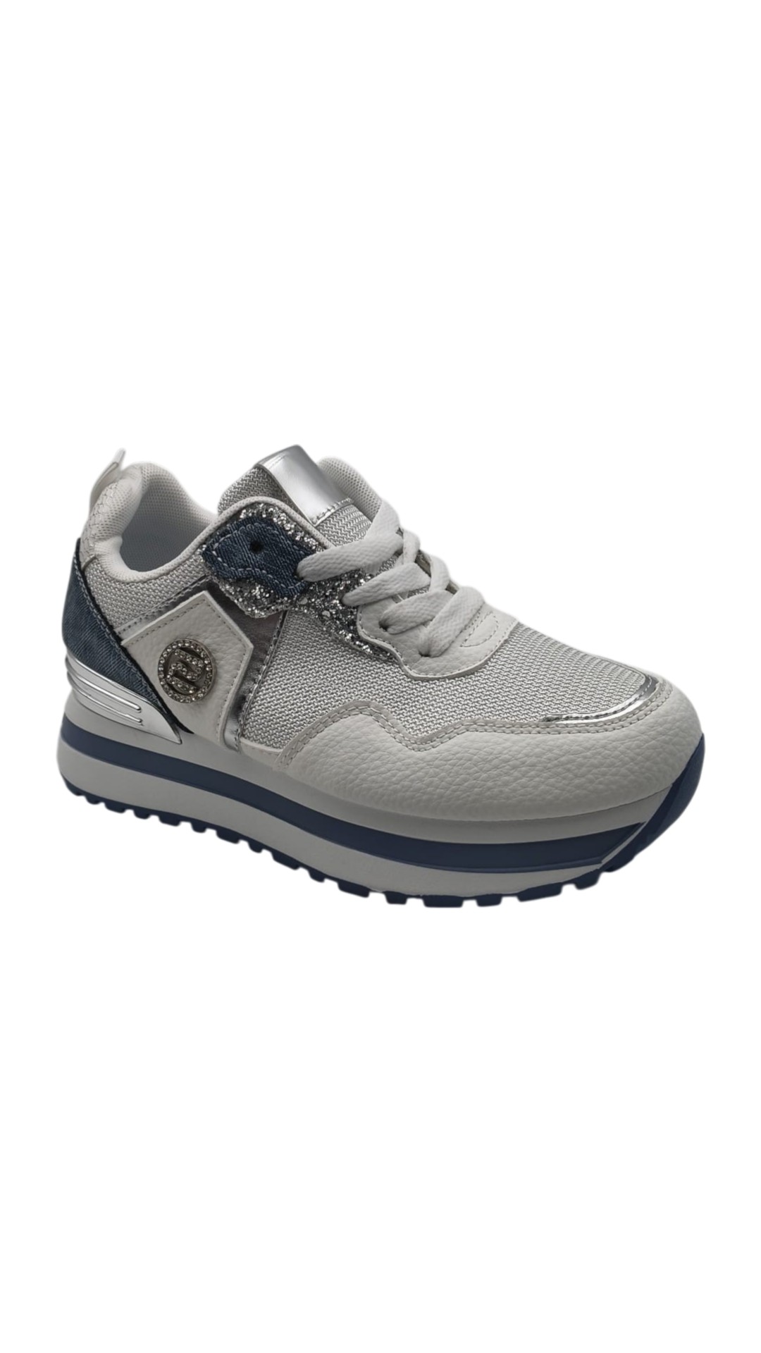 Realizzate con una combinazione di materiali, presentano una base bianca arricchita da inserti effetto denim e dettagli luminosi che donano carattere e originalità. Il design dinamico è pensato per chi ama distinguersi anche nei look casual.