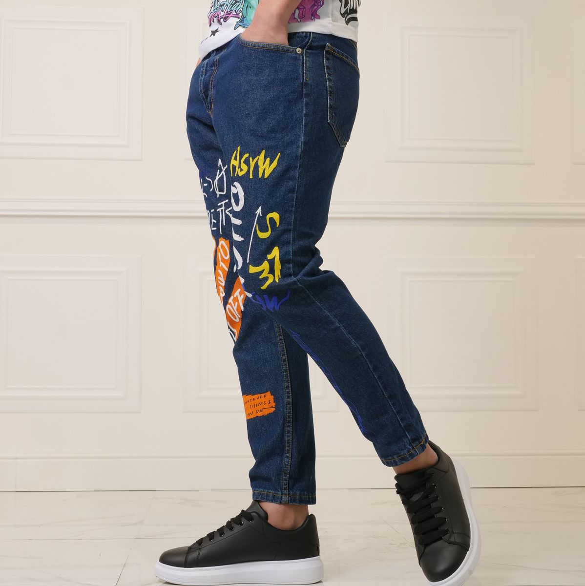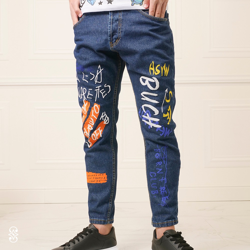 Porta il tuo stile urbano a un nuovo livello con questo jeans da uomo in denim blu dal design streetwear. Le stampe graffiti multicolor creano un forte impatto visivo e rendono il capo perfetto per chi vuole distinguersi con un look moderno e creativo.