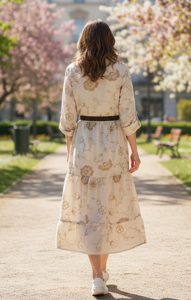 La cintura in vita valorizza la silhouette definendo le forme in modo naturale, mentre la gonna lunga con balza dona movimento e leggerezza ad ogni passo. I delicati dettagli ricamati aggiungono un tocco romantico e ricercato, rendendo questo vestito ideale per occasioni speciali, cerimonie estive o look casual chic da giorno.