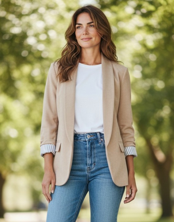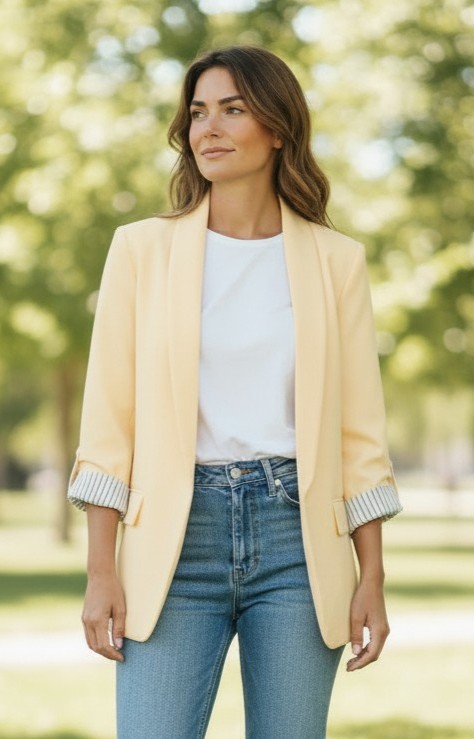Il blazer donna beige è il capo perfetto per completare ogni outfit con un tocco di eleganza contemporanea. Caratterizzato da un raffinato rever sciallato e da una linea fluida, questo blazer unisce stile e versatilità in un design essenziale e sofisticato.