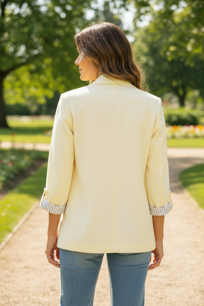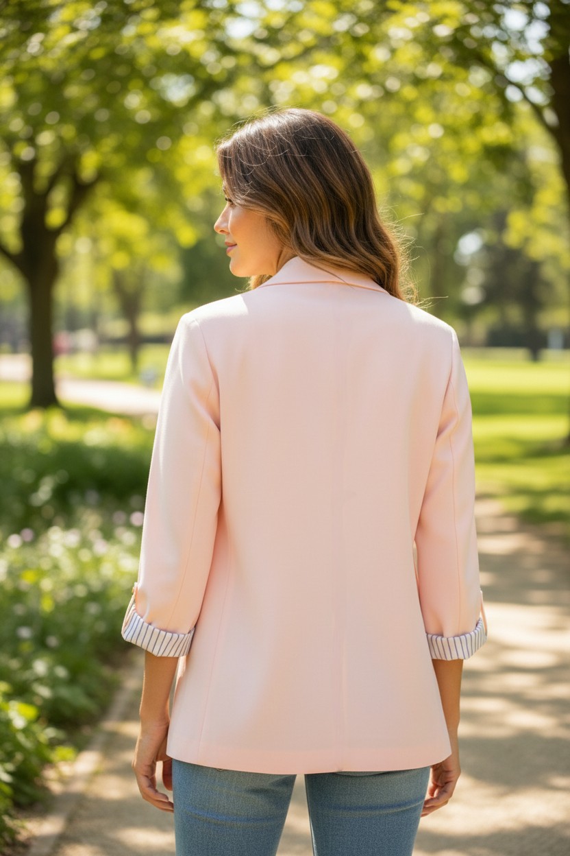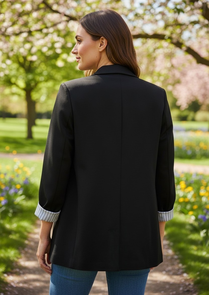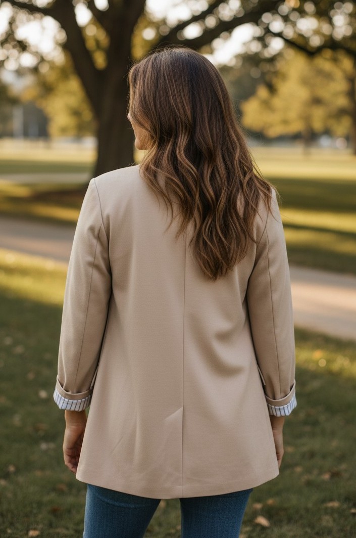 La vestibilità morbida lo rende ideale sia per look formali che casual chic. Le maniche con risvolto e la fodera interna a righe donano un dettaglio ricercato e moderno, perfetto per chi ama distinguersi con discrezione.