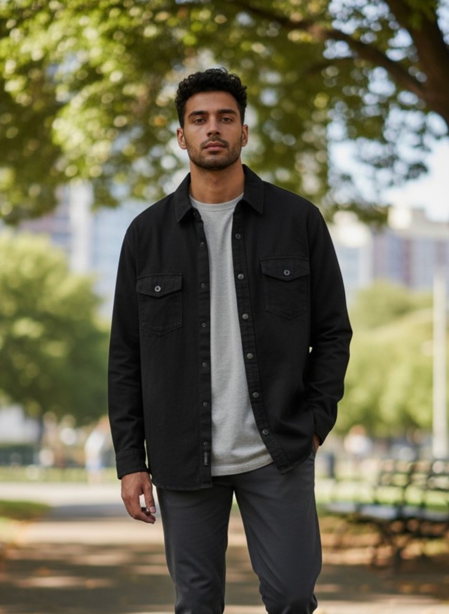 Il colore nero è esaltato da bottoni a contrasto in metallo, che conferiscono un tocco industriale e moderno.Dotata di due tasche frontali sul petto con chiusura a bottone , per uno stile "workwear". La vestibilità è studiata per offrire massima libertà di movimento, rendendola perfetta da indossare sopra una t-shirt o come pezzo unico.