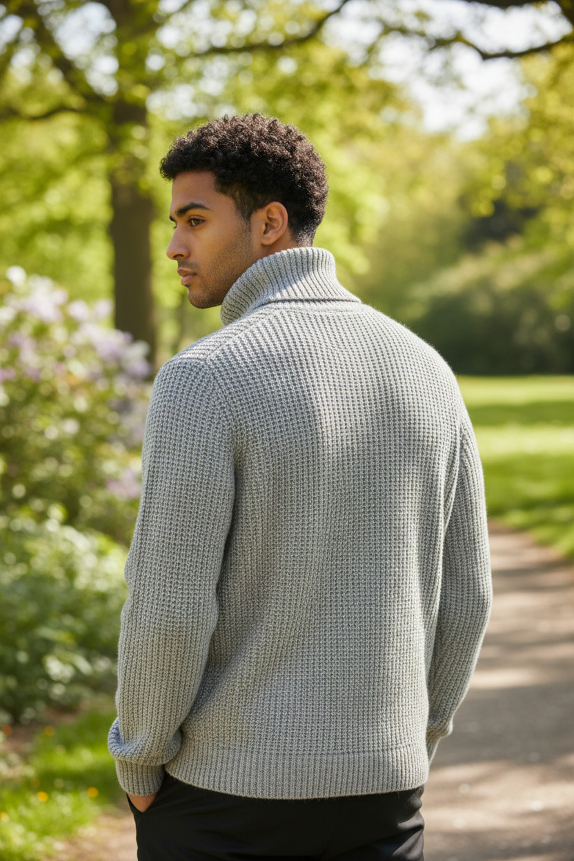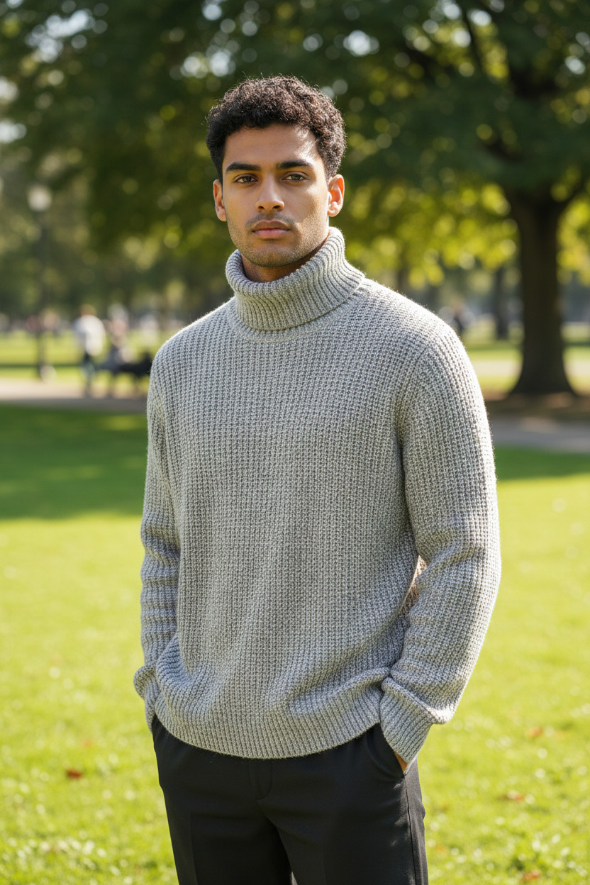 Il maglione uomo dolcevita con lavorazione texture rappresenta una scelta elegante e contemporanea per il guardaroba maschile. Il design minimalista è valorizzato dalla maglia strutturata con lavorazione waffle, una tecnica tessile che crea un effetto tridimensionale capace di aggiungere profondità e carattere al capo.