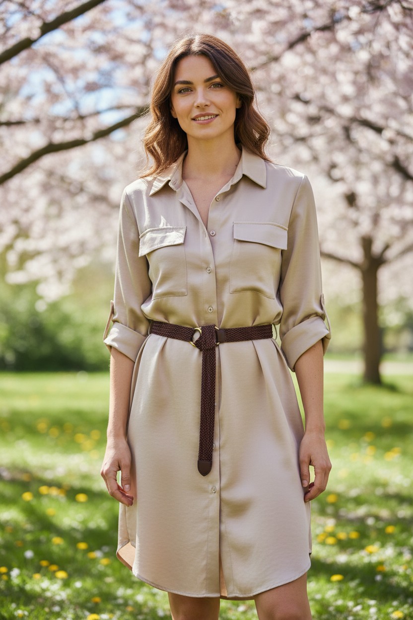 Realizzato con un design fluido e leggero, presenta colletto classico, chiusura frontale con bottoni e tasche sul petto, dettagli che richiamano lo stile sartoriale della camicia. La cintura in vita regolabile valorizza la silhouette, donando equilibrio tra comfort e eleganza.