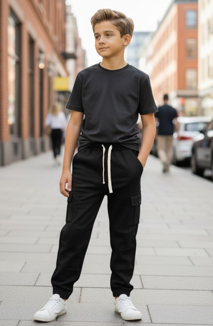 La vita con lacci elastici regolabili assicura il massimo comfort e una vestibilità ideale per ogni ragazzo, mentre le tasche cargo laterali aggiungono un tocco street contemporaneo e funzionale.